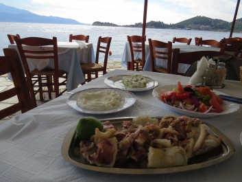 Mittagessen Kalamares Salat Käse